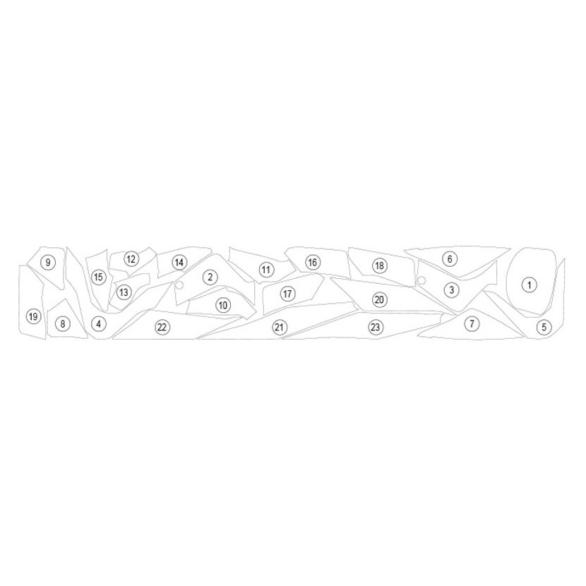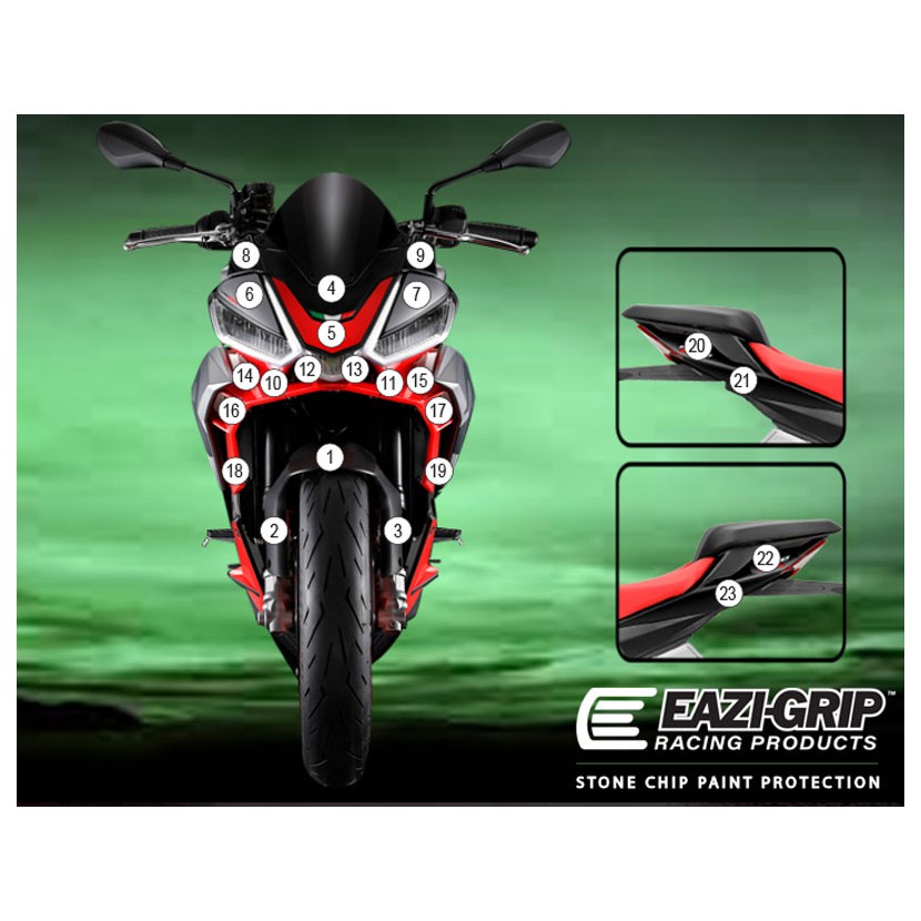 Folia Eazi-Guard jest łatwa w aplikacji. Kupując zestaw dedykowany do opisanego tutaj motocykla otrzymają państwo w zestawie gotowe, wycięte pod wymagany wymiar zestaw wraz z wszelkimi akcesoriami niezbędnymi do przyklejenia ich na motocykl. Zdjęcie na dole przedstawia kształt i ilość fragmentów do przyklejenia.