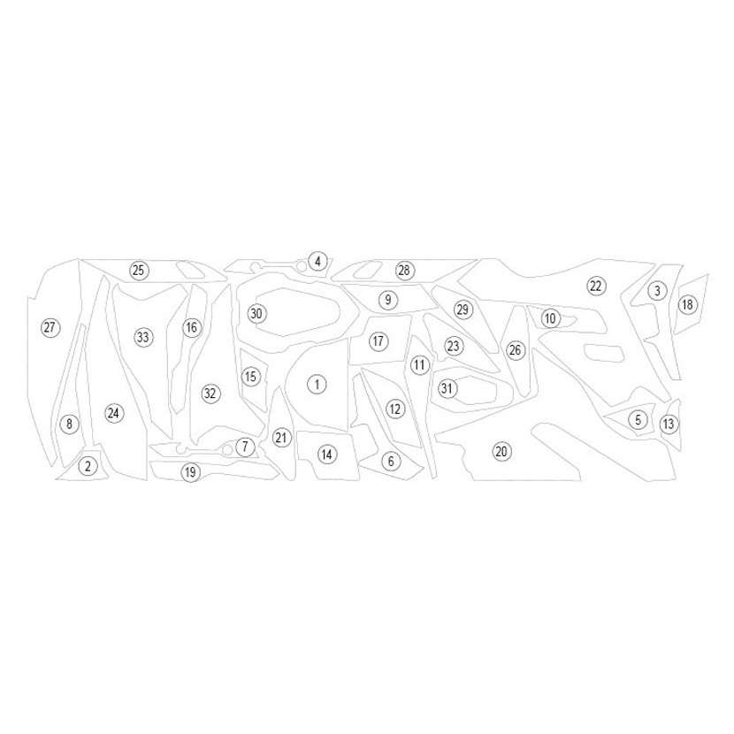 Folia Eazi-Guard jest łatwa w aplikacji. Kupując zestaw dedykowany do opisanego tutaj motocykla otrzymają państwo w zestawie gotowe, wycięte pod wymagany wymiar zestaw wraz z wszelkimi akcesoriami niezbędnymi do przyklejenia ich na motocykl. Zdjęcie na dole przedstawia kształt i ilość fragmentów do przyklejenia.