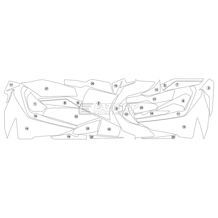 Folia Eazi-Guard jest łatwa w aplikacji. Kupując zestaw dedykowany do opisanego tutaj motocykla otrzymają państwo w zestawie gotowe, wycięte pod wymagany wymiar zestaw wraz z wszelkimi akcesoriami niezbędnymi do przyklejenia ich na motocykl. Zdjęcie na dole przedstawia kształt i ilość fragmentów do przyklejenia.