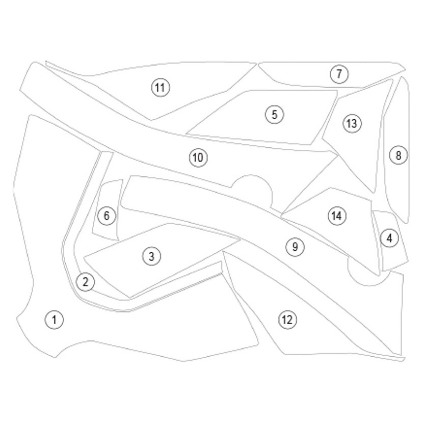 Folia Eazi-Guard jest łatwa w aplikacji. Kupując zestaw dedykowany do opisanego tutaj motocykla otrzymają państwo w zestawie gotowe, wycięte pod wymagany wymiar zestaw wraz z wszelkimi akcesoriami niezbędnymi do przyklejenia ich na motocykl. Zdjęcie na dole przedstawia kształt i ilość fragmentów do przyklejenia.