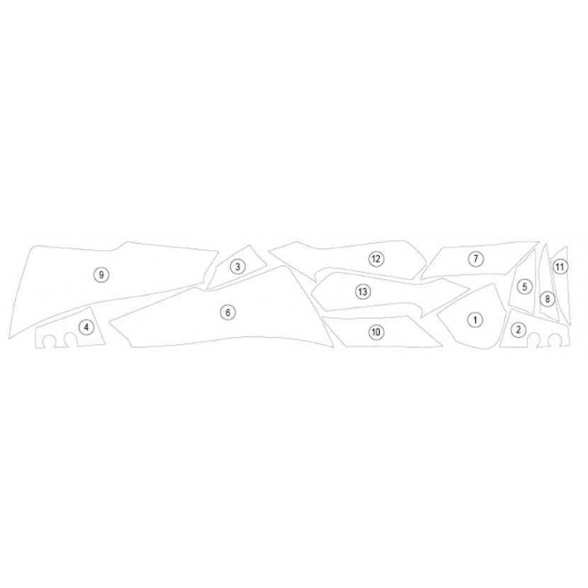 Folia Eazi-Guard jest łatwa w aplikacji. Kupując zestaw dedykowany do opisanego tutaj motocykla otrzymają państwo w zestawie gotowe, wycięte pod wymagany wymiar zestaw wraz z wszelkimi akcesoriami niezbędnymi do przyklejenia ich na motocykl. Zdjęcie na dole przedstawia kształt i ilość fragmentów do przyklejenia.