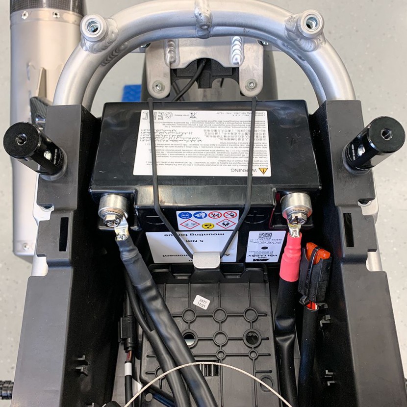 Umożliwia łatwe i skuteczne mocowanie go do oryginalnego bagażnika. Akumulator (zgodny z wymiarami OEM) jest mocowany do przykręcanej aluminiowej płyty bazowej za pomocą gumowej podkładki. Zestaw jest wymagany, jeśli oryginalne siedzenie zostanie pominięte i akumulator nie będzie już zabezpieczony przez siedzenie.